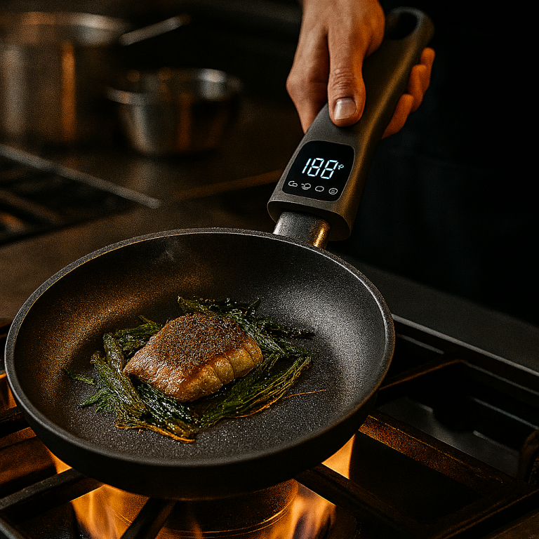 Pfanne mit digitaler Anzeige im Griff zur Temperaturkontrolle von Speisen