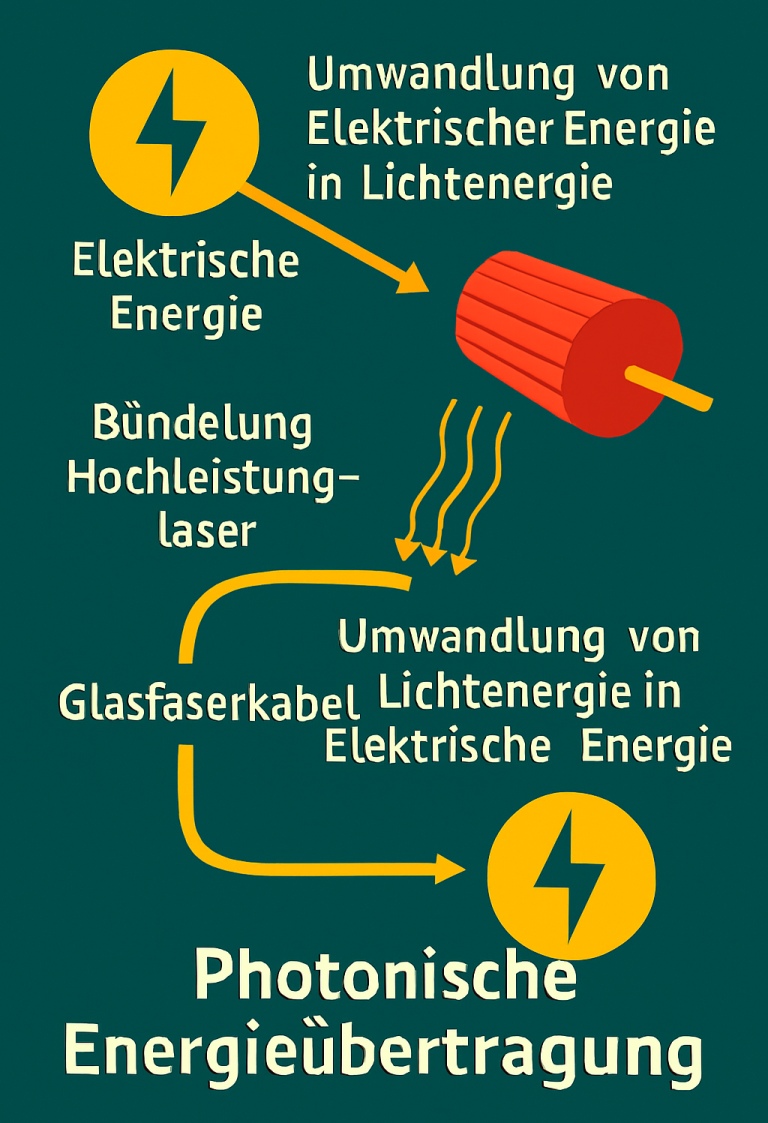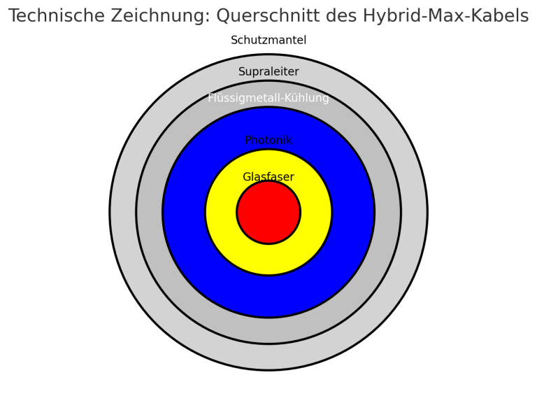 Hybrides Glasfaserkabel mit Metallmantel zur simultanen Datenübertragung (rot) und photonische Energieübertragung (blau) über Licht getrennt durch eine Isolierungsschicht (gelb) umgeben von einem kühlenden Mantel (dunkelgrau) und einem äußeren leitenden Mantel (hellgrau) zur klassischen Energieübertragung.