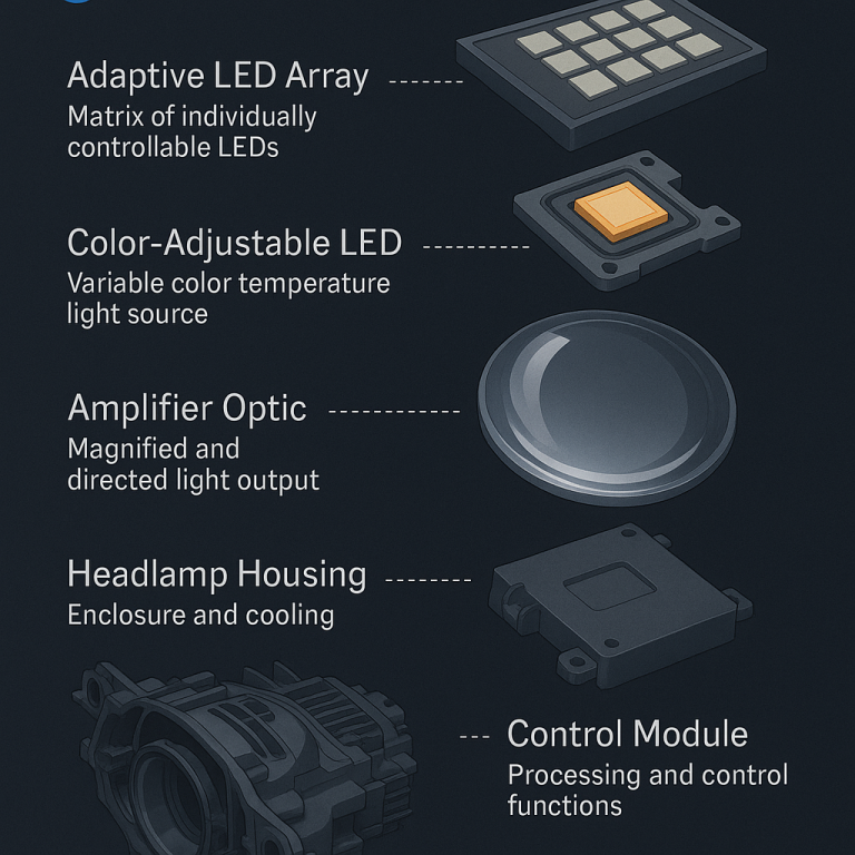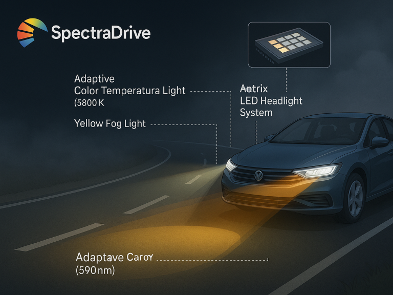 Autoscheinwerfer mit adaptivem Farblichtsystem für bessere Sicht bei Nebel und anderen Sichtverhältnissen.
