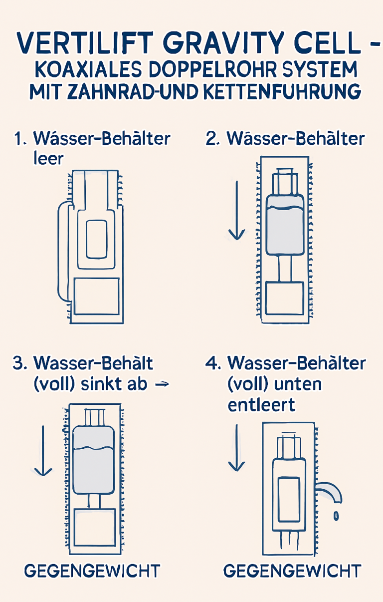 Die Vertilift Gravity Cell (Variante 2) besteht aus einem koaxialen Doppelrohrsystem mit einem ringförmigen oder rechteckigen Wasser-Behälter und einem zentral geführten Gegengewicht.